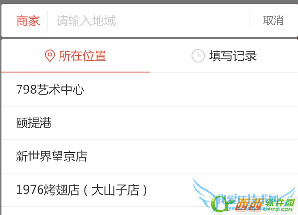 所在位置,列出当前地点附近的商家信息,可直接选择。