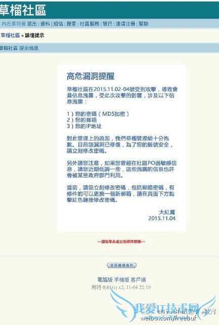 草榴社区在2015.11.4遭到攻击,导致会员信息泄露。目前漏洞已修复,但是为了会员账号安全,建议立即修改密码。