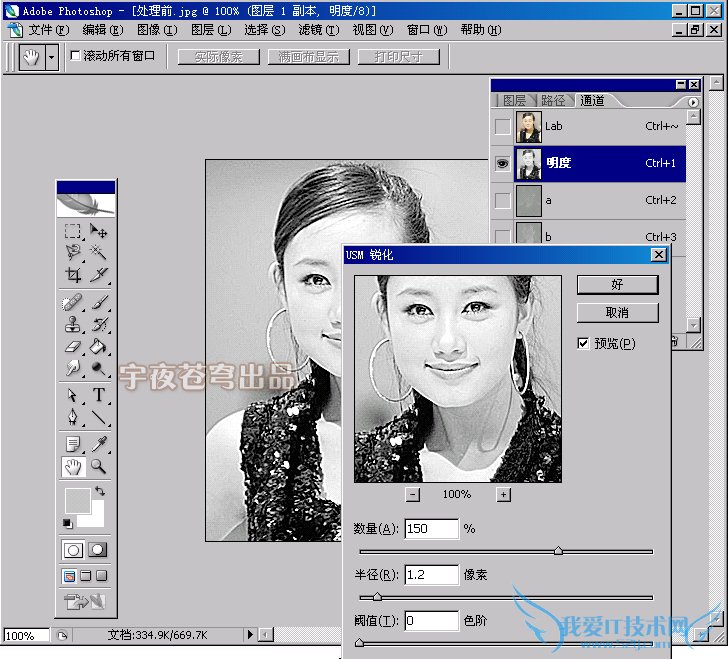 第六, 在“通道”面板中看到图层通道上有了“明度”通道,选定这个通道,再使用“滤镜”菜单的“锐化—USM锐化”命令,设置好锐化参数将这个通道锐化处理。本图如下设置。