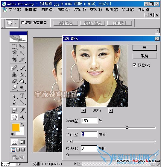 原图模糊的情况来调节,本图采用锐化数量为“150%”,半径是“1”像素,阀值不变。