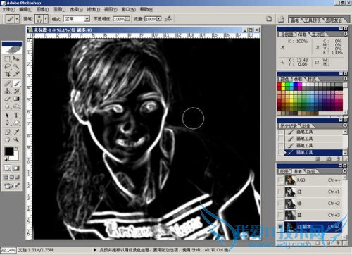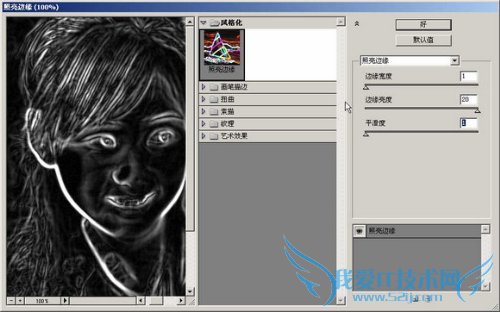 第一,激活通道面板,观察RGB三个通道,发现红色通道中的信息比较丰富,质量较高,决定用红色通道工作。复制红色通道为红色通道副本。执行滤镜-风格化-照亮边缘,参数如图。