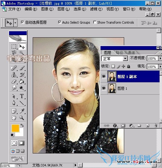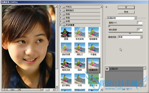 在范例中的图片,作者是使用 滤镜-艺术效果-绘画涂抹 给予适当的值之后设置适当透明度再调整图层混合模式最终完成的,实际效果不管怎么样都不理想,这里我采用的方法是将刚才拷贝的图层调用“叠加”模式+50%不透明度