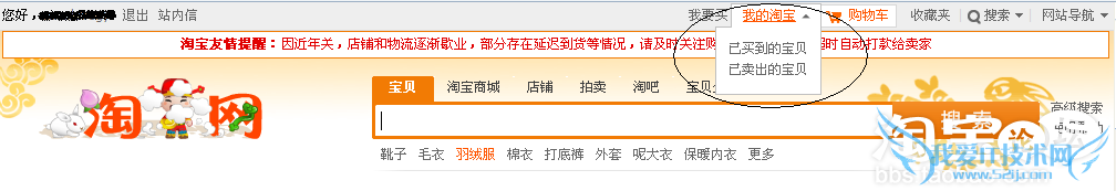 第五步:鼠标点到我的淘宝后会出现下拉菜单内容分别是已买到的宝贝和已卖出的宝贝,点击选择前者已买到的宝贝,或者直接点击我的淘宝也可以