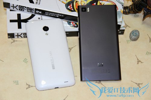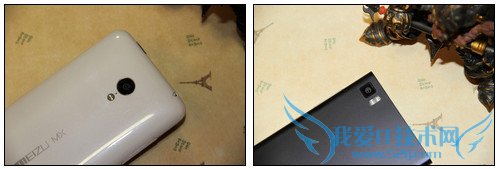 两款手机的背面可以说是风格迥异,魅族MX3还是采用亮光的塑料材质背壳,虽然握起来很舒服,但是质感略有不足。小米3在此次外观升级中就做的不错,虽然同采用塑料材质,但是亚光和仿金属质感的介入令整机的感觉就大有不同。