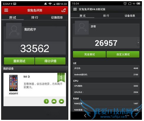 左为小米3/右为魅族MX3 安兔兔跑分结果