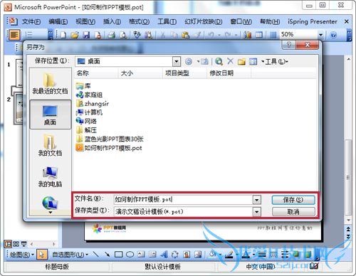 各位帅哥美女们注意啦,这一步是非常非常重要的!许多朋友设计好了之后是直接点保存的,但这是错误的,这样保存下来的文件不是PPT模板文件。正确的方法是: 在菜单栏,选中“文件”–“另存为” ,在打开的界面中进行如下设置:保存位置,可以放在桌面,“文件名”在这里暂定义为“如何制作PPT模板.ppt”。“保存类型”请选择“演示文稿设计模板”,然后点保存。接下来你可以返回到桌面看一下这个文件的图标和扩展名,发现了吗? 它的图标跟一般PPT的图标是不一样的,同时它的文件和扩展名是“如何制作PPT模板.pot”