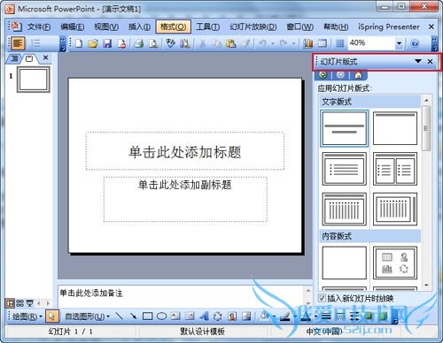 PPT模板是制作完成啦,如何使用这PPT模板呢?别急,接下来我们新建一个空白的PPT文件,这时你有没有看到PPT界面的右侧上方,有没有一个区域,显示的是“幻灯片版式”其下面有“文字版式”、“内容版式”等。如果你没有发现这个区域,那么,请在 菜单栏 打开“格式”—“幻灯片版式”选项。