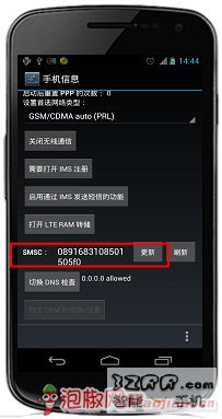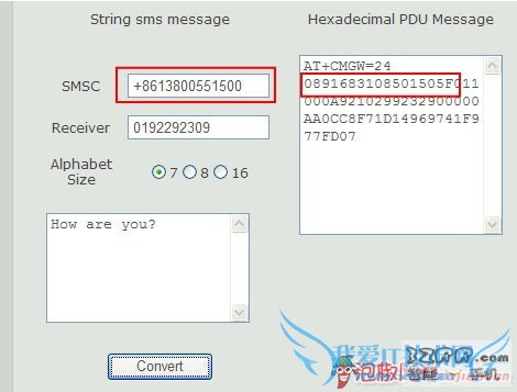 在SMSC框中输入你的短信中心号码,然后点下面的Convert,则PDU格式会在右边框中生成,然后取前18位,如我的短信中心号码的PDU格式为:0891683108501505F0,再把这18位字符输入到手机中的SMSC框中,点后面的“更新”。