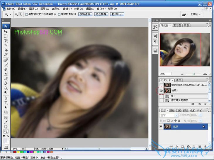 熟悉PS的人就明白了,我们其实是把高斯模糊的图层,设置成了“历史记录画笔”的目标涂层。