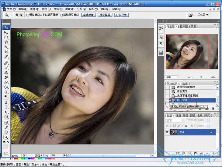*不好意思,这一步很多人没有看明白,其实是我自己没有说清楚,其实这一步有更简单的方式,就是用鼠标点一下上面那个步骤“向下合并”,就可以了,这样,照片就回到了刚才的状态。