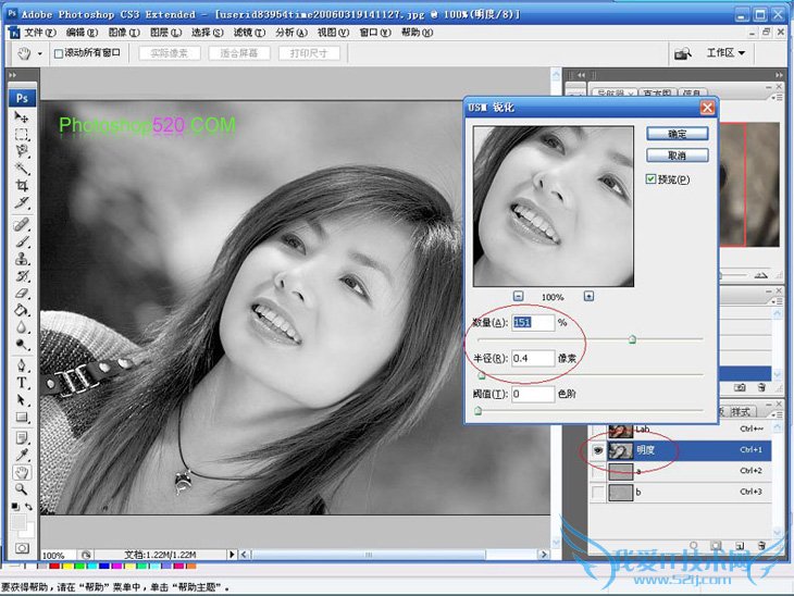 是照片全部处理好了以后,为了让照片看上去头发一丝一丝的,就要把照片做相应的锐化。如果是直接在RGB模式里做锐化,会出现头发发白的现象,锐化后的效果很生硬。转成LAB的模式里,直接在明度的层里做,这样色彩不受影响。