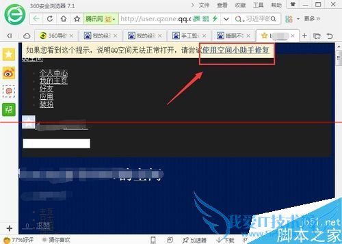 2、这时,qq空间网页的上方会出现一个提示,提示你可以通过修复功能恢复正常,如图所示。