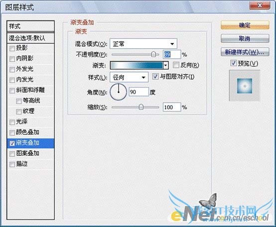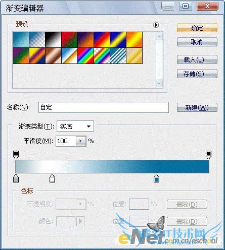 13、双击【光影】图层的缩略图,调出图层样式对话框,选择【渐变叠加】,参数设置如下图所示。其中【渐变编辑器】中三个色标的颜色值依次是:#a6c2cd,#ffffff,#07709f。