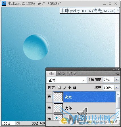 8、点击图层调板下方的【创建新图层】按钮,新建一层,并命名为【高光】。然后,使用白色填充选区,并将不透明度调为77%,效果如下图所示。