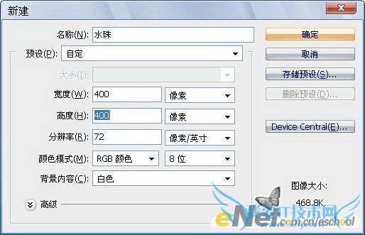 1、打开Photoshop,执行【文件—新建】命令,新建一个400×400像素的文件,并命名为【水珠】,如下图所示。