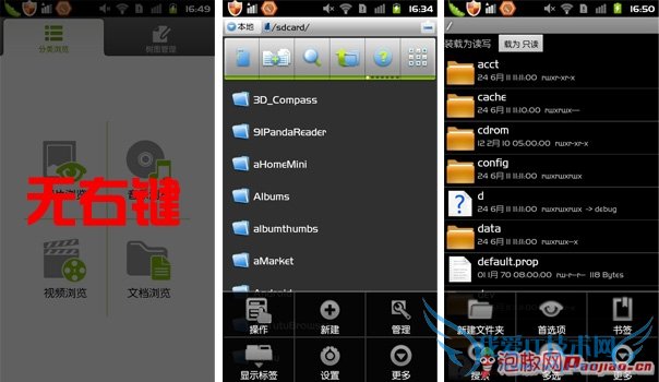 RE文件管理器:RE的界面也非常简单,一进入就只是一个文件夹列表,最上面选择只读文件或者读写文件,我们可以通过需求进行选择,只读的文件无法修改,读写的可以修改,这个比较适合进阶的用户来修改或美化系统。