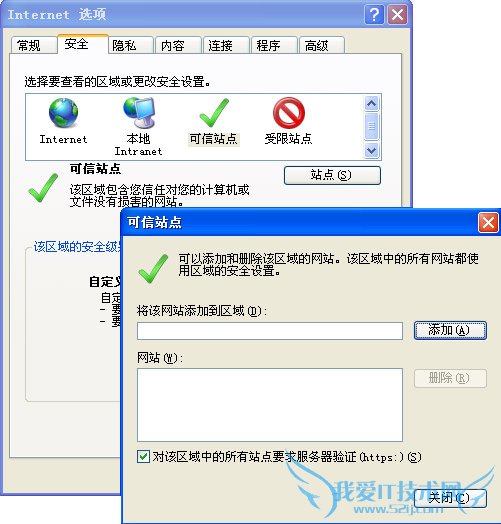 在页面中,点击菜单栏中的工具选项,然后在下拉菜单中选择【Internet选项】,在弹出的界面中,我们点击上面的安全按钮,然后在该界面中点击“可信站点”,然后在界面中点击【站点】按钮,接着将会弹出一个对话框,我们输入刚才提示的错误地址就可以了。然后点击确定。