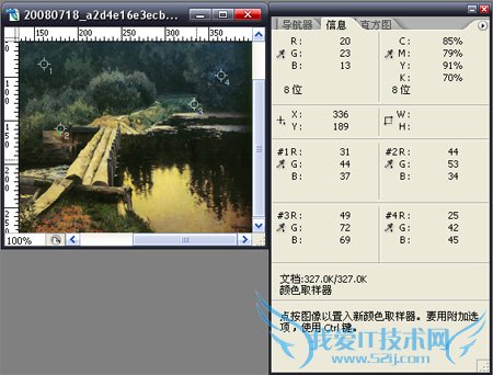 可以在图像中最多定义四个取样点,而且颜色信息将在信息面板中保存。我们可以用鼠标拖动取样点,从而改变取样点的位置,如果想删除取样点,只需用鼠标将其拖出画布即可。