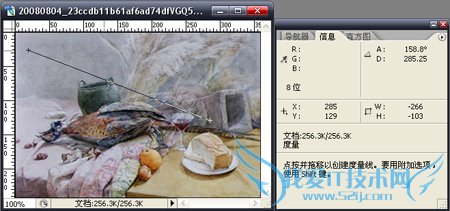 使用度量工具,可以测量两点或两线间的信息。信息将在信息面板中显示。使用方法为:选择度量工具在图像上单击“确定起点”,拖拉出一条直线,单击后就确定了一条线段;然后按Alt键创建第二条测量线。