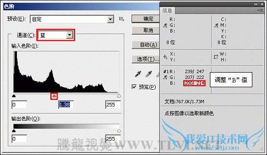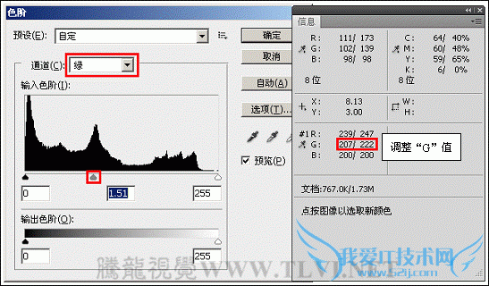 (8)按下键,打开“色阶”对话框,参照以上方法分别设置“红”、“绿”、“蓝”通道的选项参数,