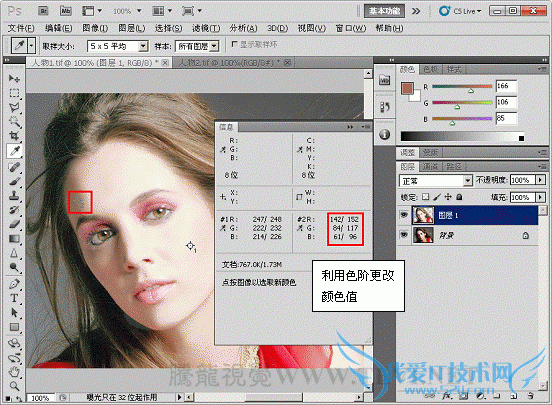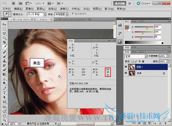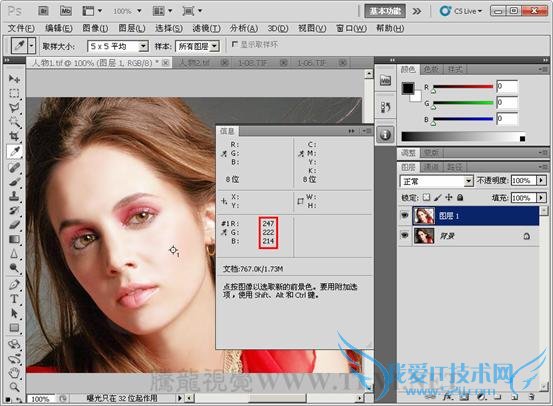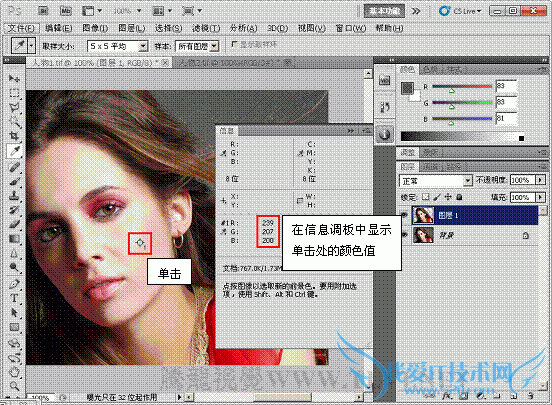 (3)在人物面部高光区域设置取样点,此时会自动弹出“信息”调板,