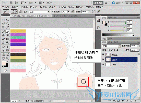 提示: 为了使设计师能够把精力全部放在绘图上,Photoshop为用户提供了快捷键来切换“画笔”和“吸管”工具。在选择了“画笔”的状态下,按下键盘上的 Alt键,会切换到“吸管”工具,吸取颜色后,松开Alt键将自动转换回“画笔”工具,这时可以在图稿中继续绘图。