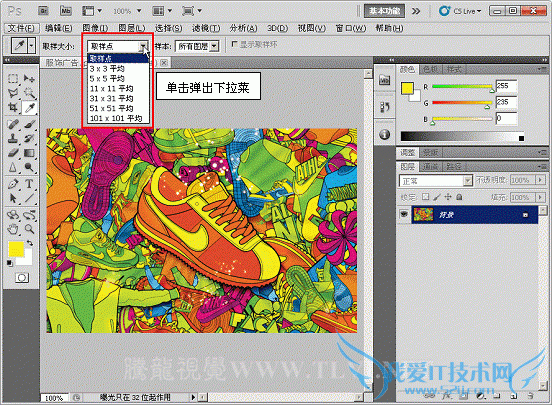 吸管工具的任务栏如图3所示,其取样大小选项用来设定吸管工具的取色范围(如图所示),包括;取样点,3X3平均,5X5平均。