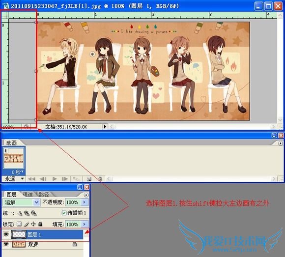 7.把图层1先移到左边画布之外。(注意:要刚刚好到边缘的位置哦~).