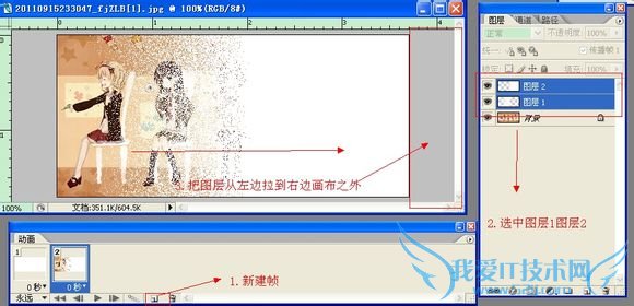 新建帧、然后选中图层1和图层2.拉到右边画布之外。