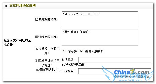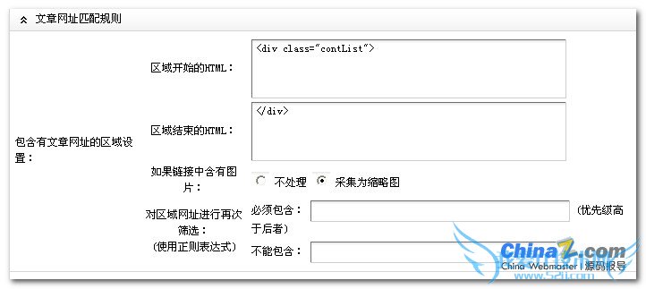 文章网址匹配规则。查看目标列表页源代码,设置要采集文章网址区域的开始和结束的html,接下来又是dedecms特点之一,如果采集网址页面链接有 图片可直接设置采集为缩略图,非常方便。对区域网址进行再次筛选功能也有特色,除支持正则表达式外还声明了“必须包含”和“不能包含”的优先级,本篇体验 目标站无干扰网址,所以留空。