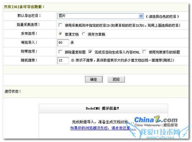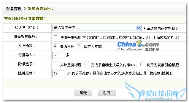 采集完成后点右上角的“导出数据”,然后选择导出栏目,如果你在前面启用了“多栏目通配(#)”并指定了栏目ID,则要勾选此处的“批量采集选 项”,其余选项根据自己需求选择,然后确定。如果勾选了“完成后自动生成导入内容HTML”则会在导入完后自动更新网站,否则就要先手动去生成。