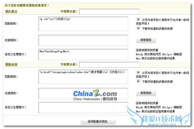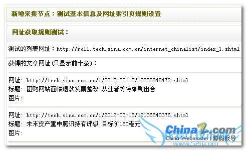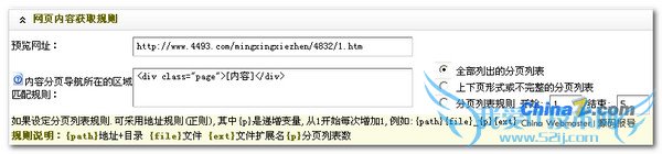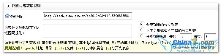 网页内容获取规则。系统会默认一个采集url为预览网址,另外内容分页导航所在的区域匹配规则也很灵活,除了和phpcms一样有全“部列出的分页列表模式”、“上下页形式或不完整的分页列表模式”外,还多了一个“分页列表规则”。
