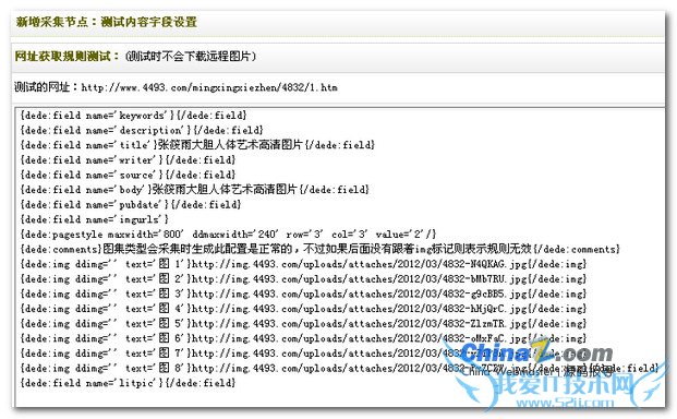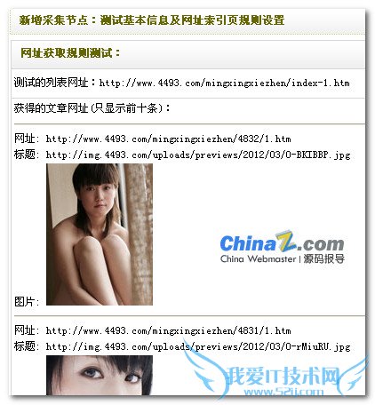 新建采集节点的时候选择“图片集”,进入到采集节点设置和文章采集一样,体验测试采集目标和上一篇文章一样为http://www.4493.com/mingxingxiezhen,设置如图: