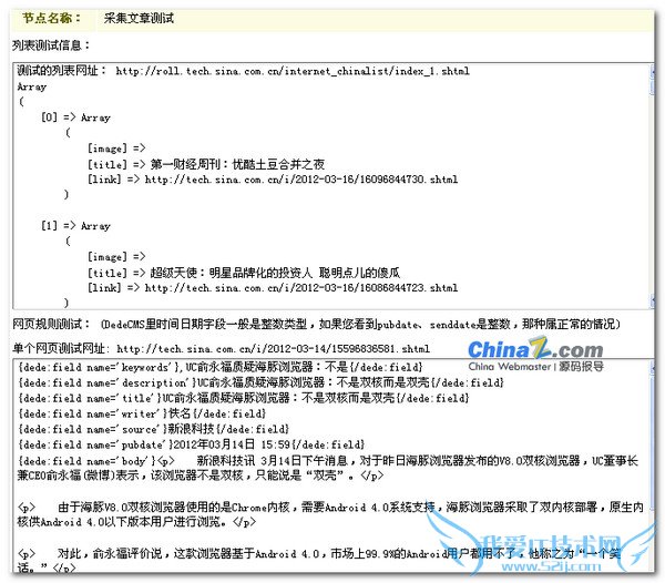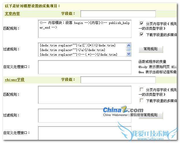 dedecms的文章内容采集非常强大,除了匹配规则和过滤规则,还有个“自定义处理接口”。如果你有php基础的话,可以通过此功能对采集结果@me 进行各种处理,强大到不行啊。以后小编会专门发一篇此功能的讲解文章。最后,不能直接在采集管理处新增采集字段,只能在对应内容模型管理中增加字段,采集 管理会自动增加。如小编在“普通文章”内容模型那增加了一个“chinaz字段”,则采集设置中自动增了一个“chinaz字段”项目。