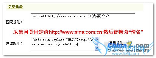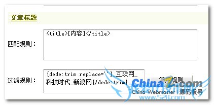 各字段内容采集,dedecms的内容匹配规则和phpcms一样:“起始无重复HTML[内容]结尾无重复HTML”,[内容]即为所采内容。过滤规 则是{dede:trim replace=""}规则{/dede:trim},多个规则的话一个一行,如果要替换成指定的值,则只要在replace=""的引号里设置即可。