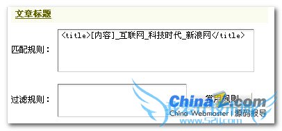 其中,内容摘要、关键字、缩略图系统会用正则进行自动匹配,我们只需设置过滤内容即可。其余字段分别设置匹配规则和过滤规则,系统同样自带了几个常用的 过滤规则,但是点击“常用规则”后为弹出小窗口模式,稍微有点不方便。针对本测试的标题采集,以下两种方式都是可以的,如图: