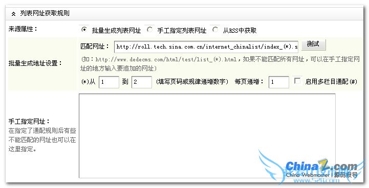 列表网站获取规则。同上篇文章分析,列表网址是有规律的可批量生成。这里要说下dedecms的强大之处,不仅获取列表网址的方式能灵活组合,而且如果 目标网站整站使用的都是同一个模板,就可以启用“多栏目通配(#)”功能,通过设置后一个采集规则就可以采集整站并发布不同栏目了,而不需要一个栏目对应 一个规则。(此功能小编会另外单独写一篇教程)