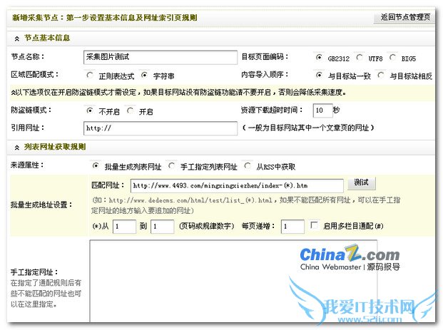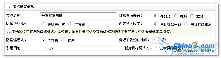 设置节点基本信息。目标源码同上篇文章所说,通过查看目标网站源代码后设置,区域匹配模式默认字符串,只有在字符串无法确定区域的时候才用正则表达式, 不过一般都用不上。最后就是织梦cms采集的特点之一防盗链模式,如果目标网站有防盗链功能则开启次功能可以成功采集,但是会降低采集速度。次测试目标网 站没防盗链功能,所以不开启。
