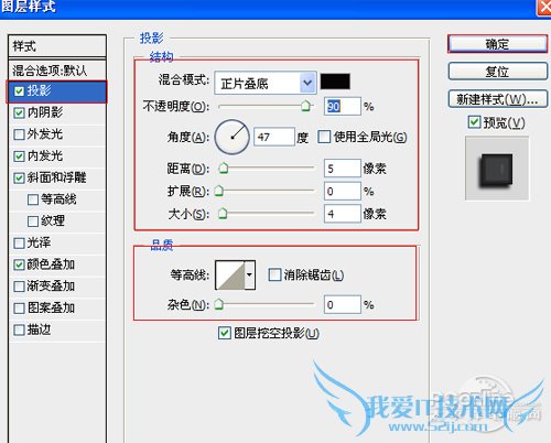 21、勾选投影,设置混合模式为:正片叠加,颜色为:黑色,不透明度为:100%,角度为:47度,距离为:6像素,扩展为:0%,大小为:4像素,如图21所示。