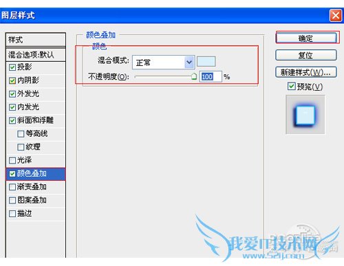 26、勾选颜色叠加选项,混合模式: 正常,点击色标处,设置光泽颜色:淡蓝色,设置颜色RGB值为:216、240、250,设置不透明度:100%,如图26所示。其它的作法都一样,经过调整后的效果图,如图27所示。