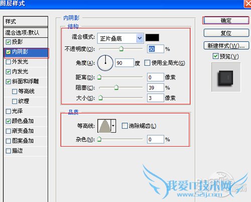 14、勾选内阴影,设置内阴影混合模式:正片叠底,点击色标处,阴影颜色设置为黑色,不透明度:50%,角度:90,距离:0像素,阻塞为:39%,大小:3像素,然后点击确定按钮,如图14所示。