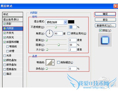 6、勾选内阴影,设置内阴影混合模式:颜色加深,点击色标处,阴影颜色设置为黑色,不透明度:45%,角度:90,距离:0像素,阻塞为:59%,大小:2像素,然后点击确定按钮,如图6所示。