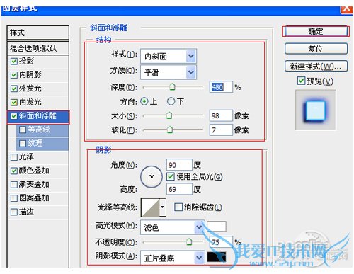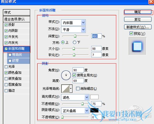 9、勾选斜面和浮雕复选项,样式:内斜面,方法:平滑,深度:480%,方向:上,大小:98像素,软化:7像素,阴影:角度:90,勾选使用全局光,高度:69度,高光模式为:滤色,颜色为:白色,不透明度为:75%,阴影模式为:正片叠加,颜色为:黑色,不透明度为:0%,其他设置值参考图9。