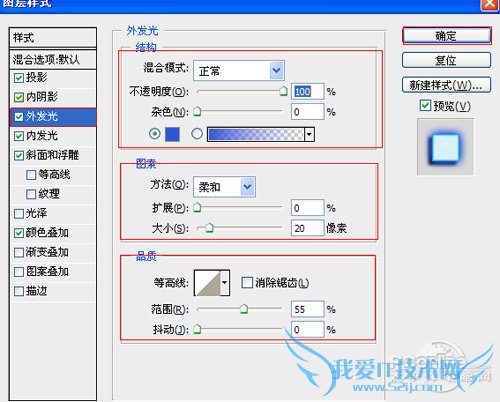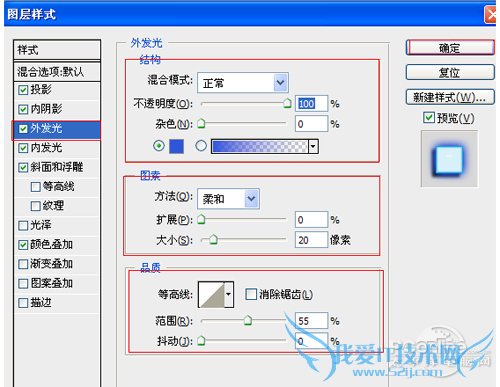 7、勾选外发光选项,设置投影混合模式:正面,不透明度:100%,点击点按可编辑渐变,设置前景到透明,颜色为蓝色到白色,方法为柔和,扩展为0%,大小为:20像素,范围为55%,如图7所示。