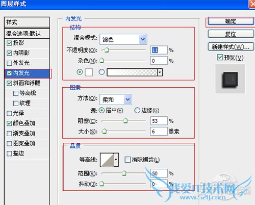 15、勾选内发光选项,设置投影混合模式:滤色,不透明度:11%,杂色:0%,点击点按可编辑渐变,设置前景到透明,颜色为白色到透明,方法为:柔和,源:居中,阻塞:53%,大小为:6像素,范围为:50%,其它设置参考图15,如图15所示。