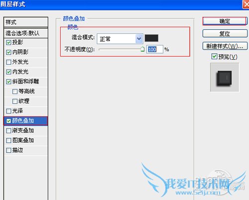 17、勾选颜色叠加选项,混合模式: 正常,点击色标处,设置光泽颜色:黑色,设置不透明度:100%,如图17所示。