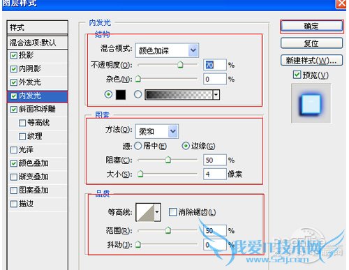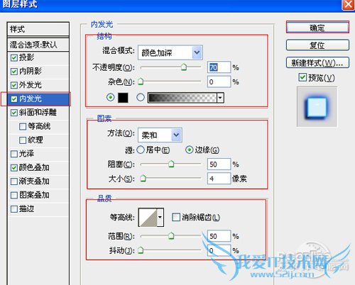8、勾选内发光选项,设置投影混合模式:颜色加深,不透明度:70%,杂色:0%,点击点按可编辑渐变,设置前景到透明,颜色为黑色到透明,方法为:柔和,源:边缘,阻塞:50%,大小为:4像素,范围为:50%,其它设置参考图8,如图8所示。