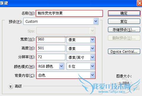 1、选择“文件/新建”菜单,打开“新建”或者Ctrl+N对话框 名称为:制作荧光字效果,宽度:为960像素,高度:为501像素,“分辨率”为72 , “模式”为RGB颜色的文档,如图1所示。