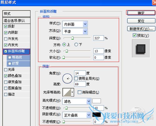 16、勾选斜面和浮雕复选项,样式:内斜面,方法:平滑,深度:327%,方向:上,大小:13像素,软化:0像素,阴影:角度:14,高 度:69度,高光模式为:滤色,颜色为:白色,不透明度为:100%,阴影模式为:正片叠底,颜色为:黑色,不透明度为:0%,其他设置值参考图16,如 图16所示。