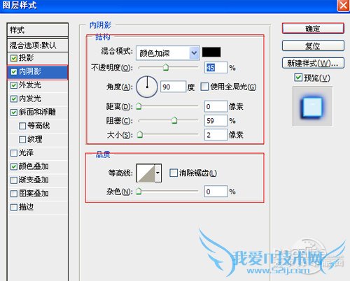 22、勾选内阴影,设置内阴影混合模式:颜色加深,点击色标处,阴影颜色设置为黑色,不透明度:45%,角度:90,距离:0像素,阻塞为:59%,大小:2像素,然后点击确定按钮,如图22所示。